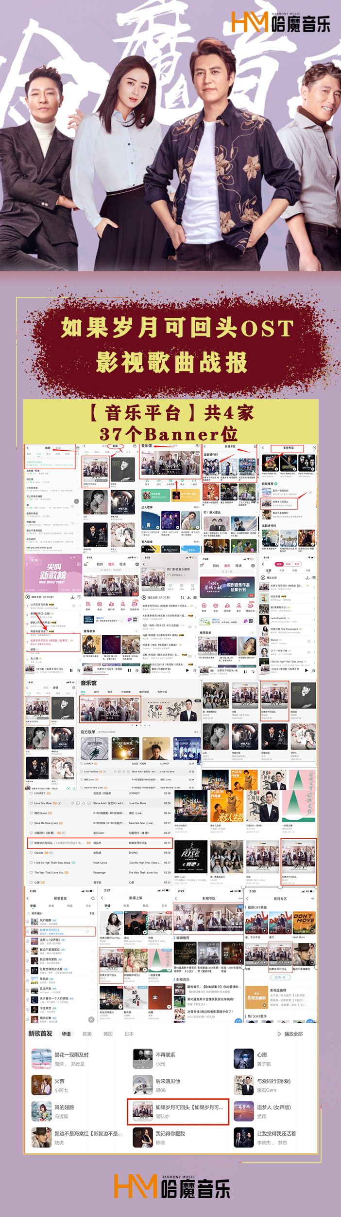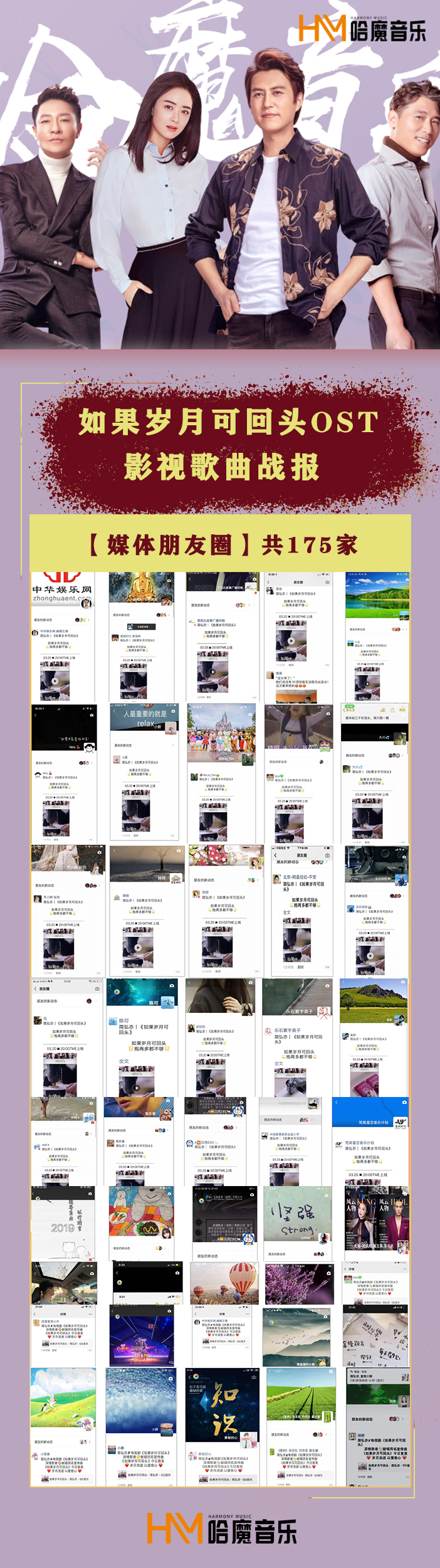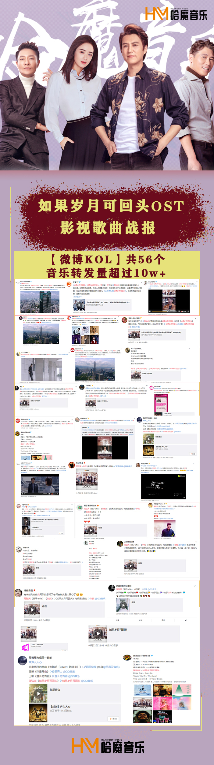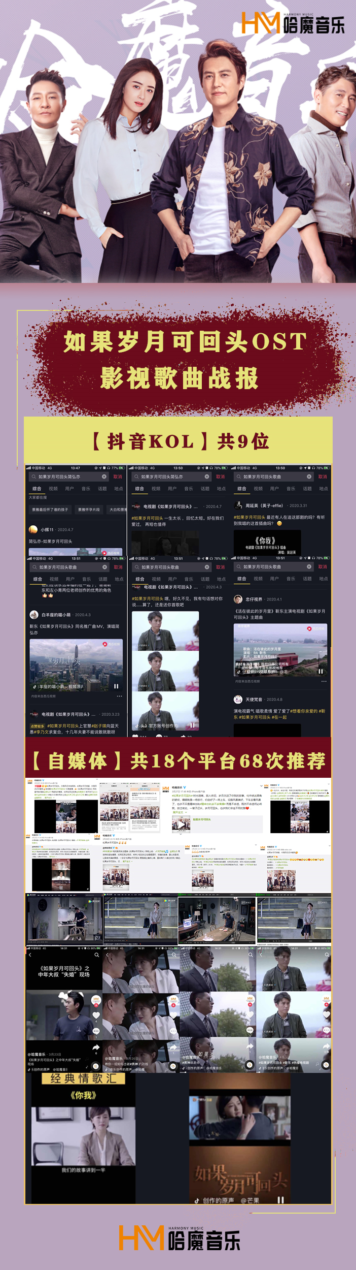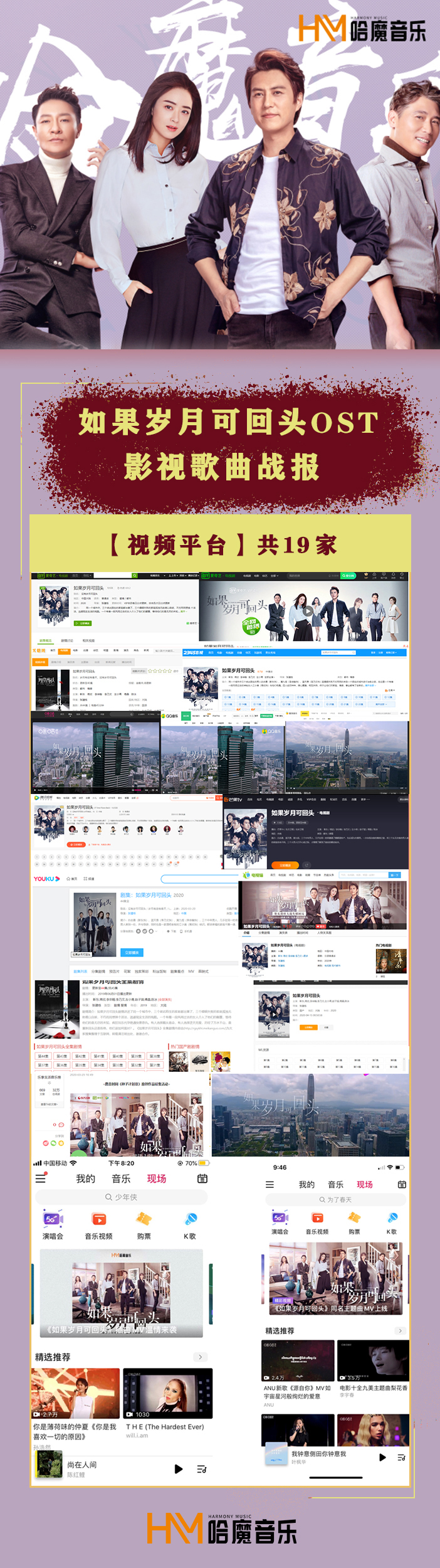 此次电视剧《如果岁月可回头》剧中那个两首影视OST歌曲都有哈魔音乐量身打造,宣传曲/插曲《如果岁月可回头》以及插曲《你我》。哈魔音乐歌曲制作及发行。3月20日与电视剧同步在QQ音乐和咪咕音乐酷我音乐和酷狗音乐上线,上线仅三个小时评论就突破999+,电视剧收视率首播当晚就达到了2.8%。